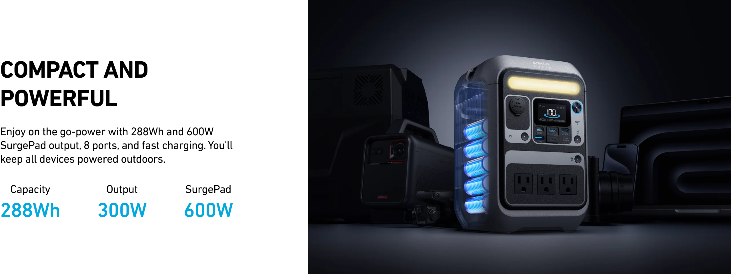 Power more, carry less: Delivers 300W (600W surge) and 288Wh in a compact body that’s ~15% smaller than similar designs.