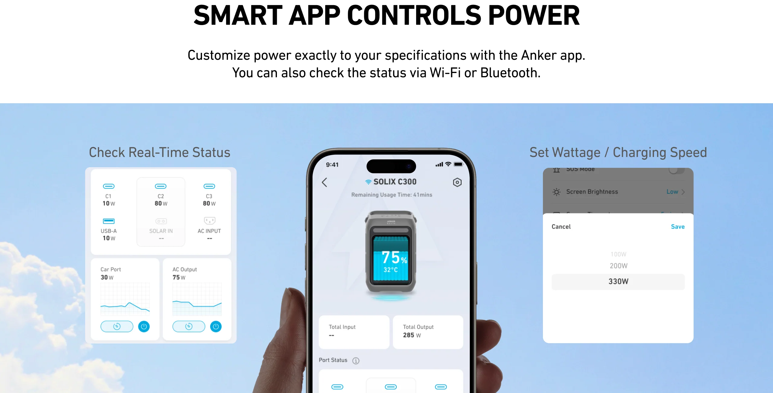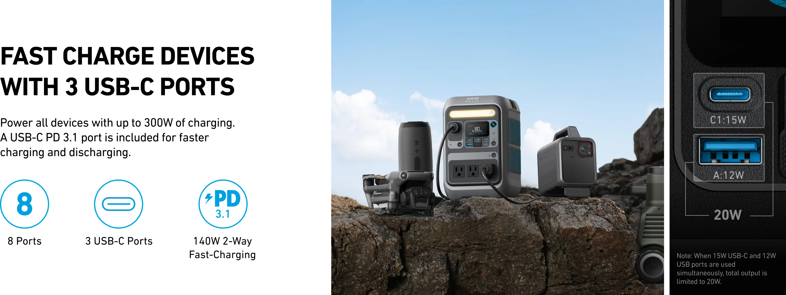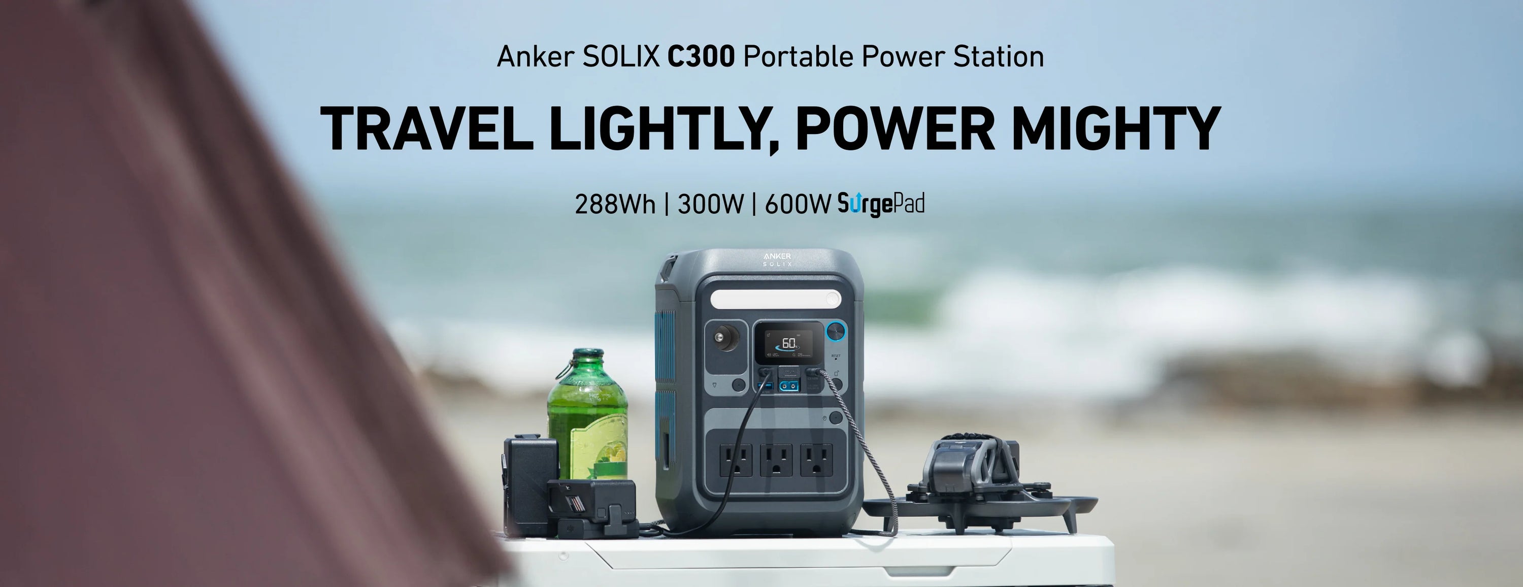 The ANKER SOLIX C300 AC 288W is a portable power station designed for everyday reliability and easy travel. With 300W of output (600W surge) and a 288Wh capacity, it powers essentials like laptops, phones, cameras, fans, and small appliances—without the bulk. Dual 140W USB-C ports enable fast two-way charging, while eight total ports let you run multiple devices at once. Recharge quickly at home or stay off-grid with compatible solar panels. Built with durable LiFePO4 batteries and advanced temperature management, the C300 is made to last for years—quietly, safely, and efficiently.