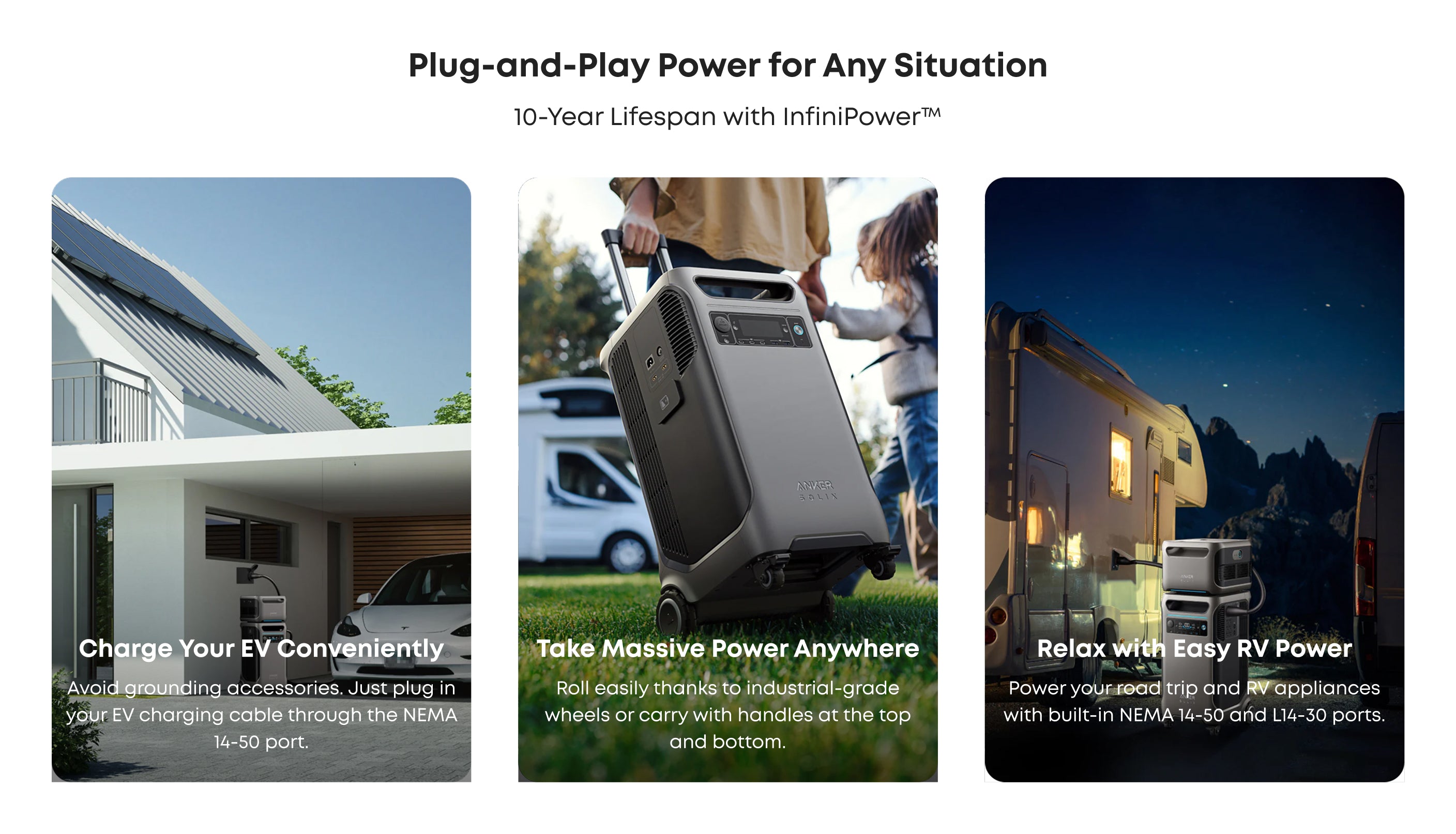 Built for a decade of daily use – EV-grade LFP batteries and InfiniPower™ design support a 10-year lifespan.